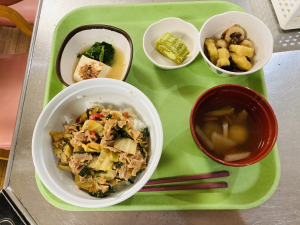 今回は、焼き豚(やきとん)丼、つみっこ汁というものが出ました!