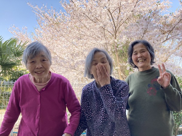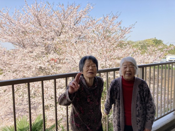 1階利用者様の仲良し3人娘、2階の仲良しコンビで、少しアングルを変えて素晴らしい桜の木をご覧ください。