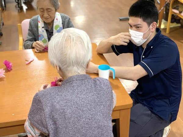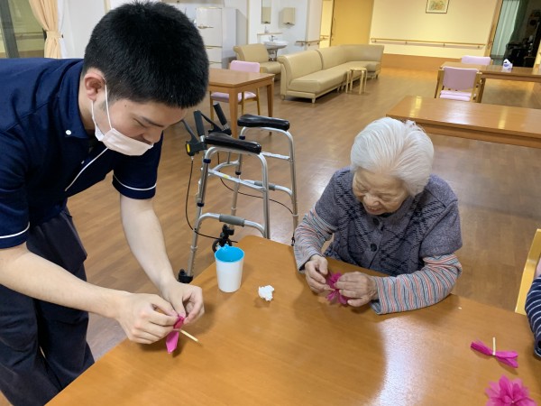 入居者さまのお話をききながら、桜を作っております。