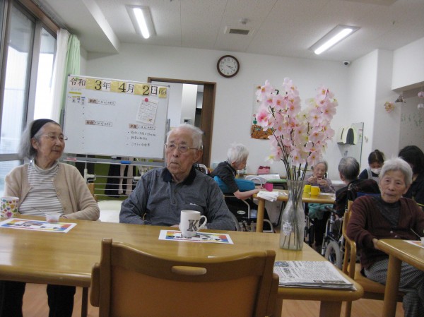 こんにちは!グループホームみんなの家・あきがせの介護ブログです。よろしくお願いいたします。桜も満開となりお花見日和ですが、コロナ過なのでホール内にて花瓶に飾った桜を見ながらのお花見をしました。綺麗ね!!お水が入っていないけど・・・ 本物ではないのでお水は不要なのです。あ~~!!そういう事ですか?でも、綺麗よ!!と心も和みました。