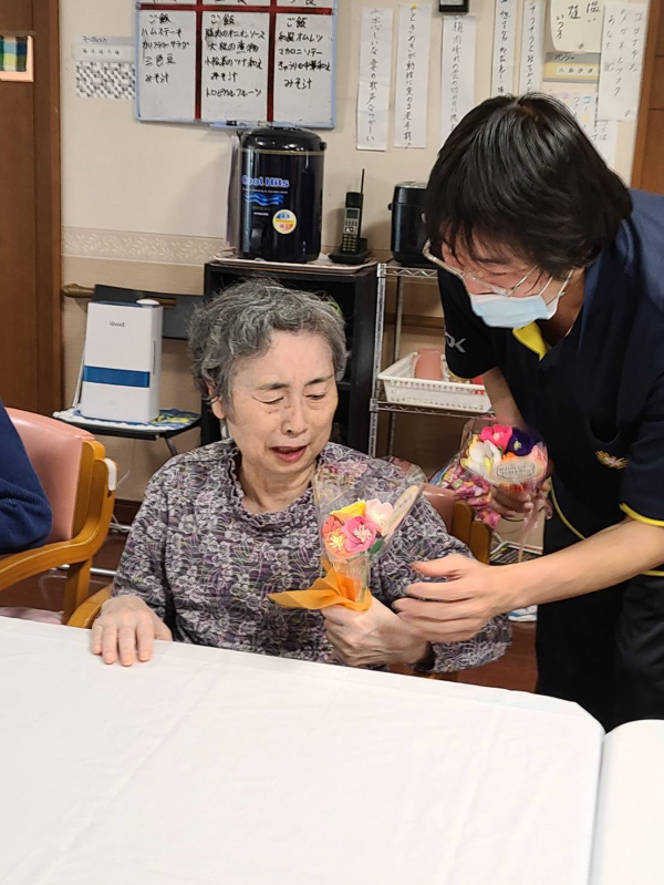 受け取った色紙とスタッフ手作りのフェルトフラワーを渡しました。