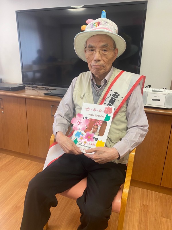職員一同よりバースデーカードと、ジャンボシュークリーム☆そして入居者様方&スタッフでハッピバースデー♬のお歌でお祝いさせて頂きました。