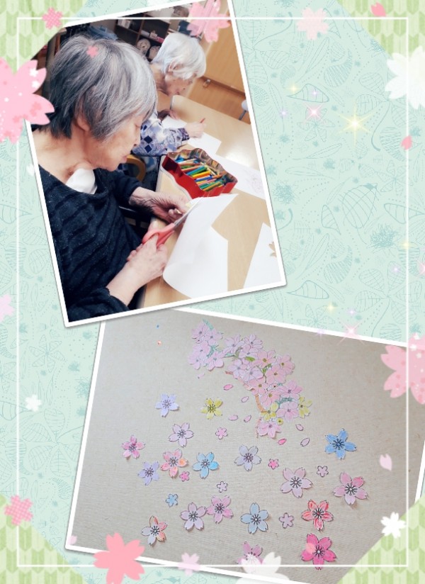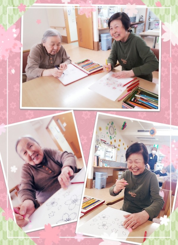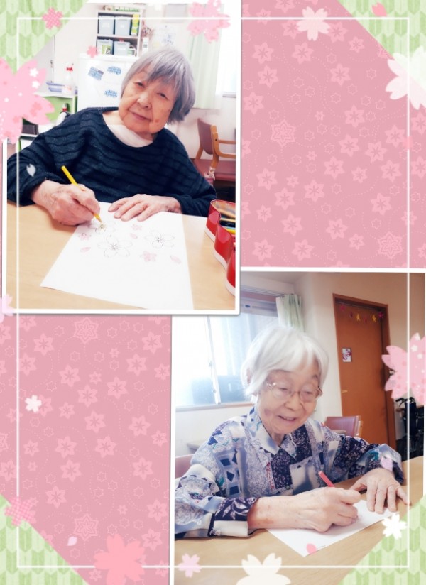 急いで、利用者の皆様に、桜の塗り絵を手伝ってもらって