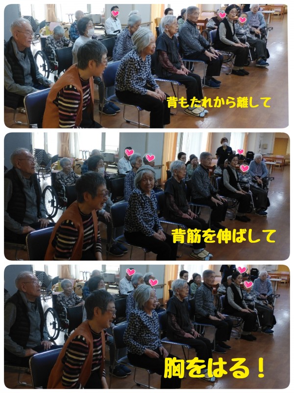 顔をしっかりあげて、背筋を伸ばし、胸をはった良い姿勢を保てるように
