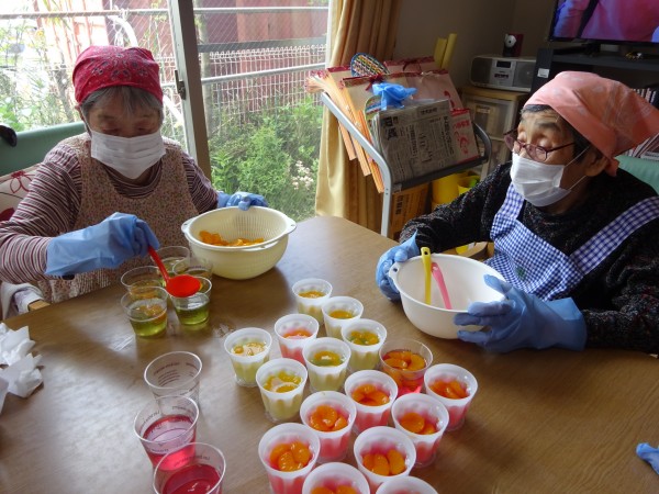 更にコロナ禍のこのご時世ですので、皆様マスク着用の上、手指の消毒を行って、準備万端でおやつのゼリーを作っていきます。