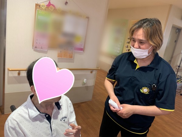 今日のお誕生日の入居者様のところへ、現れたのが赤羽根ケアスタッフ。