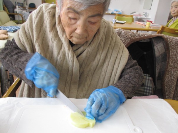 グループホームみんなの家・あきがせの介護ブログです!よろしくお願いいたします。2階手作りカレーうどんとおにぎりとデザートにチョコレートケーキを提供しました。ジャガイモを切って頂きました。主婦歴?十年のベテランらしい手さばきに感心しました!!あっという間に切り終えました。さすが・・・