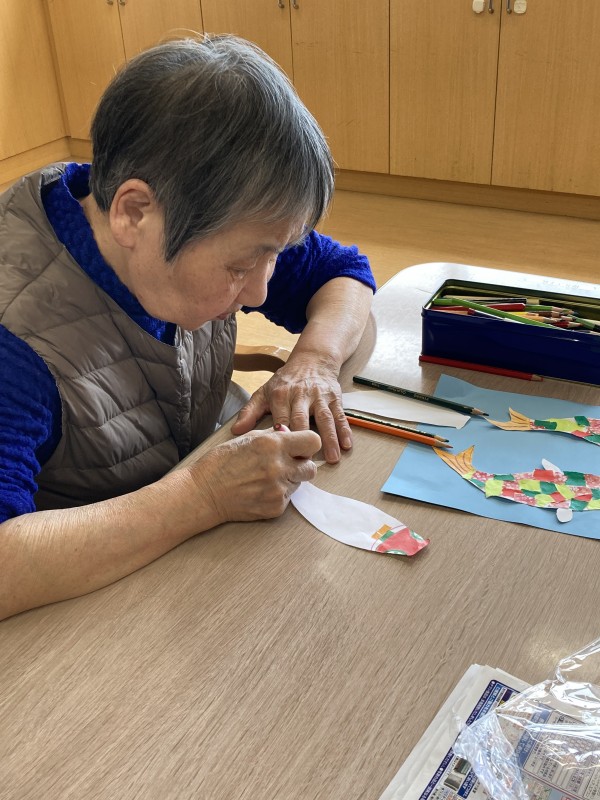 今日のレクはちぎり絵です。鯉を色鮮やかにしていきます。たくさん作っていこうと思っています。