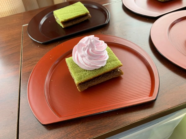 生クリームを、スポンジで出来たお菓子に添えながら。