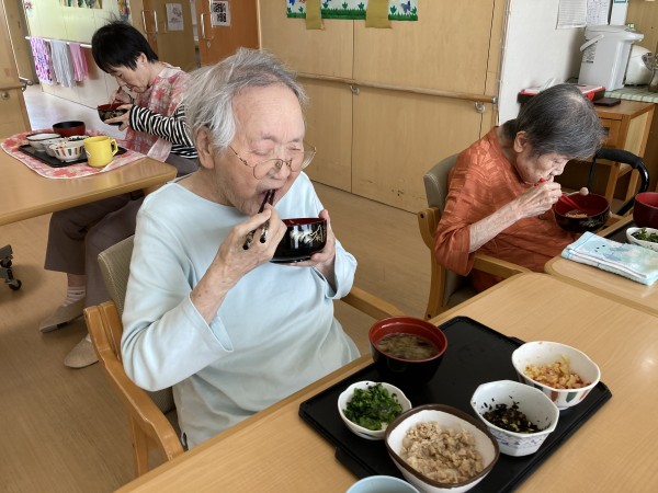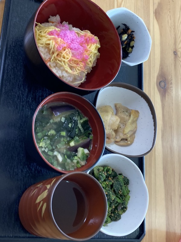 メニューは豪華で通常のおかずにプラスして、ちらし寿司、菜花のごま和え、揚げ茄子のお味噌汁です。