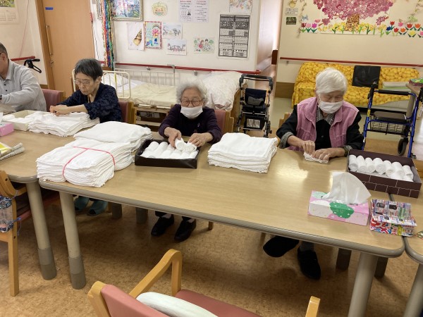 ようしやりましょう!!の一声で「おしぼりたたみ」が始まりました。