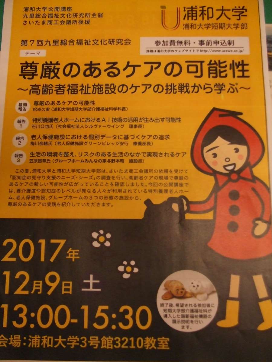 来たる12月9日(土)に第7回九里総合福祉文化研究会・「尊厳のあるケアの可能性~高齢者福祉施設のケアの挑戦から学ぶ~」というテーマを、浦和大学・浦和大学短期大学部で