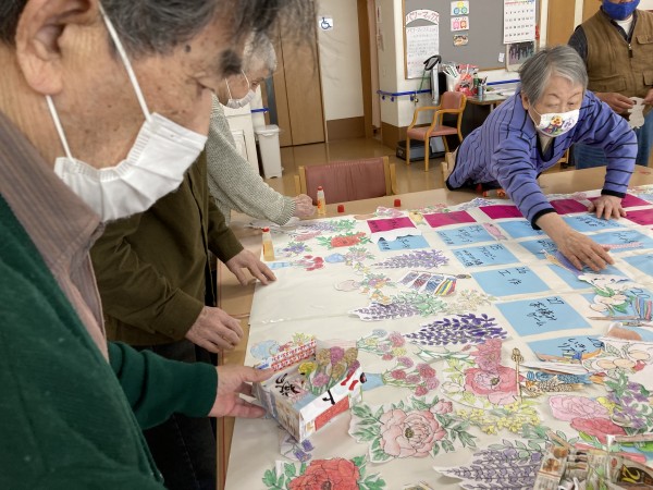 4月の午前レクの時間にぬり絵をたくさんして頂き、塗って頂いたものをハサミで切ったり、