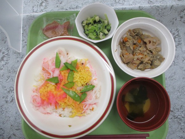 ちらし寿司・若竹汁・筑前煮・チンゲン菜の柚子みそ和え・鯛焼き