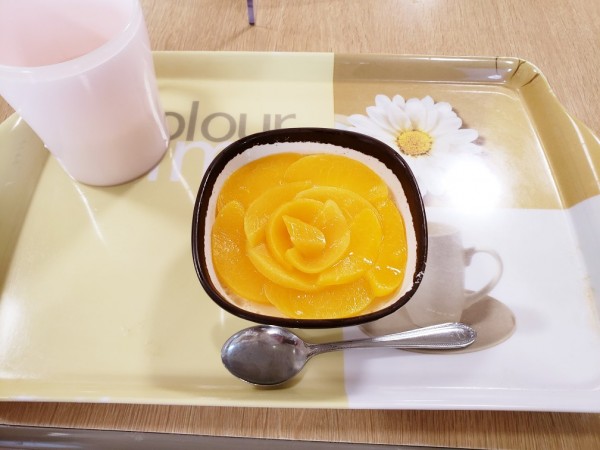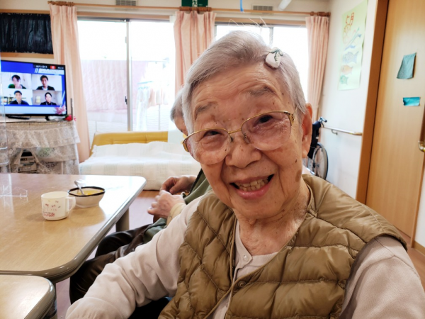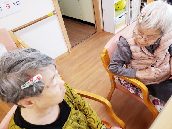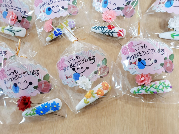 前編でも紹介した、ケアスタッフさん手作りヘアピンを女性の皆様にお渡しし、手作り薔薇プリンを召し上がられました。ヘアピンを着けると、嬉しそうにして下さり、お互いに見せあいっこをされていました。