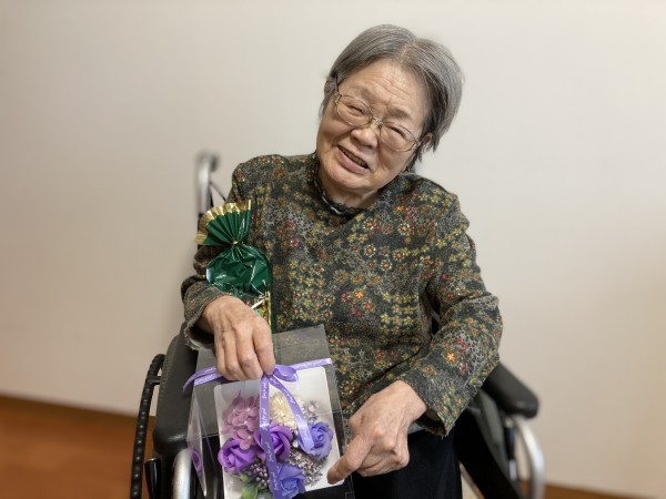 プレゼントされたお花を持ち記念撮影。満面の笑みです!