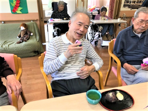 また、2階職員さんが、手作りカーネーションを18個お家で作って来られ、お一人お一人に「いつもありがとうございます」と言いながら渡されました。