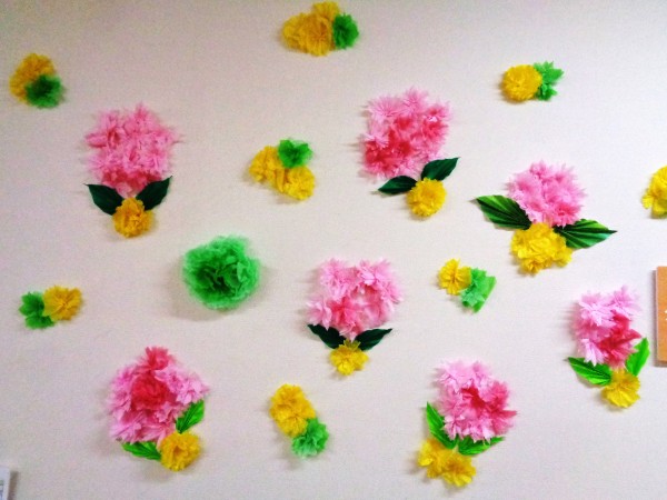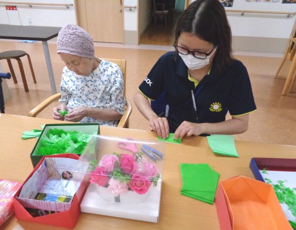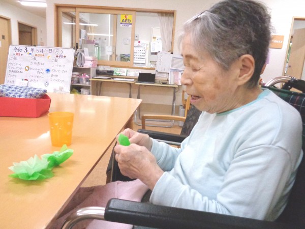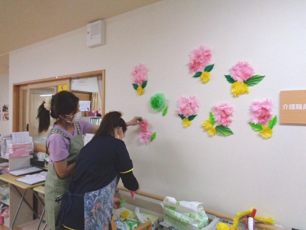 桜、鯉のぼり、また来年ね。桜を何かに・・・入居者様の提案で花束に変身するための手作業が始まりました。
