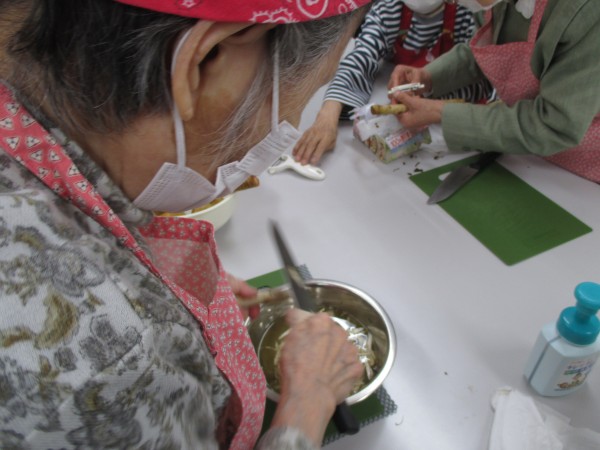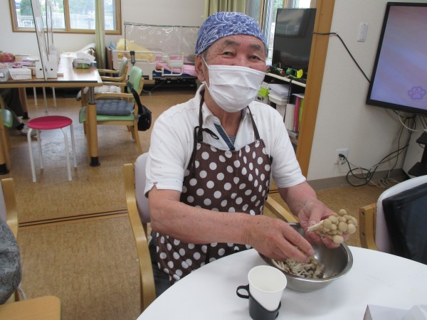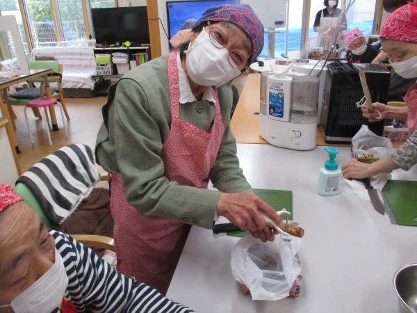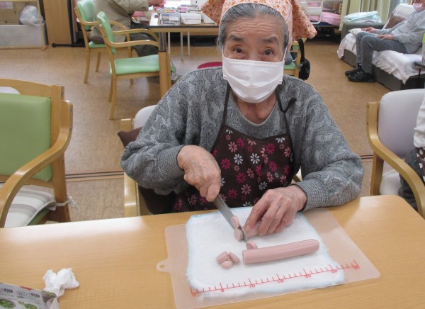 男性のご利用者も頑張ってます。女性のご利用者はどんどん野菜を切ってくださっています(汗)調理職員が焦るくらい・・・