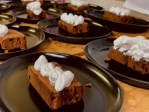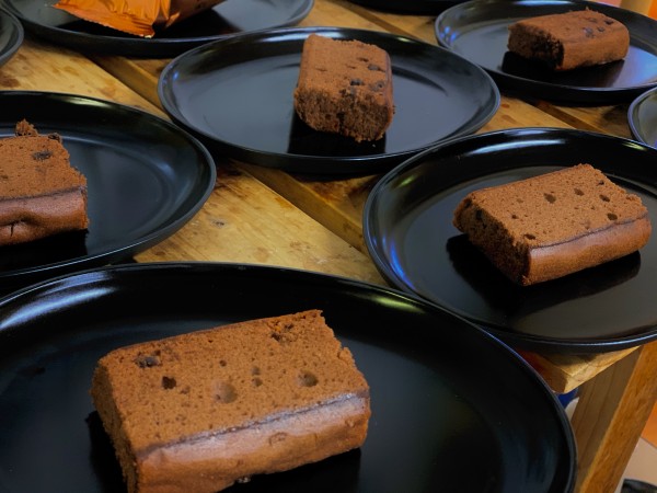 並べられたチョコケーキ…白いお布団(生クリーム)が欲しそうに見えます…。