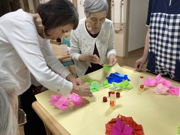 あじさいの花を折り紙で作り、飾り付けています。