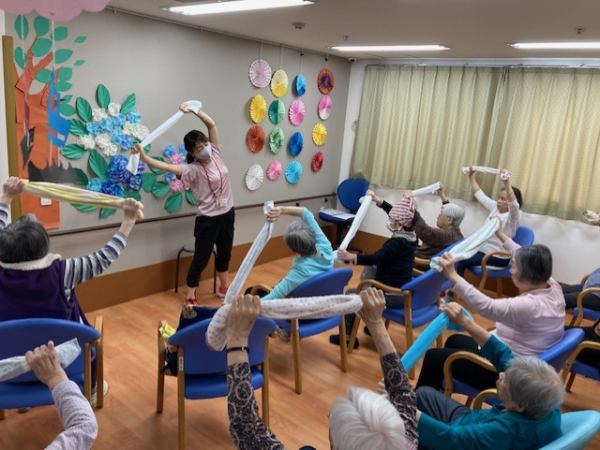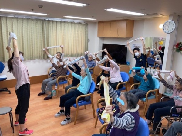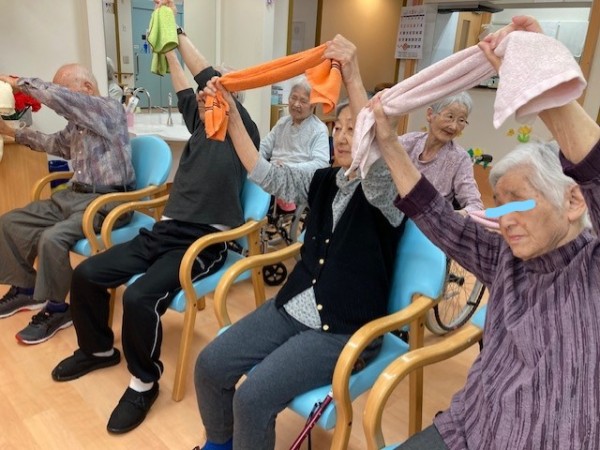5/25日に運動指導員来訪にて、「今日はタオル体操をしてみます!」との事で全員タオルを握りしめて集まりました。