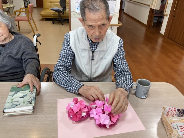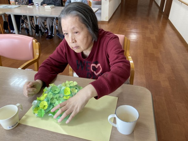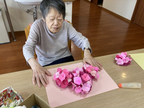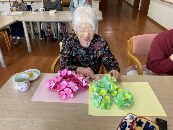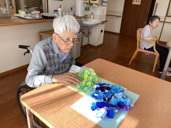 花の色の組み合わせを気にし「この色どう?」「きれいかしら?」など言われながらアジサイの花を完成させました(*^▽^*)