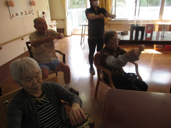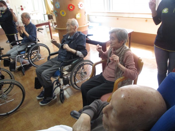 発声をしながら手や足を動かします。 二つの事を同時に行う練習です。