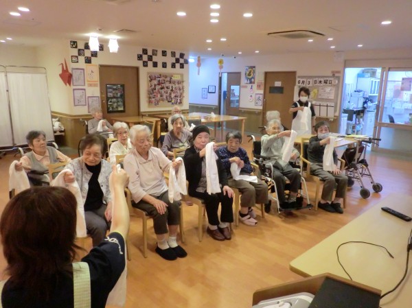 タオルを使って体を伸ばしたり、フリフリしながら腕の運動をしたりと、みんなで体を動かしていい汗かきました(^^)/