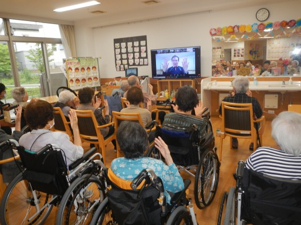 リモートでテレビに映し出されるトレーナーの画像を見ながら、認知症と寝たきり予防に特化した脳トレプログラムを笑顔でこなすご利用者様。