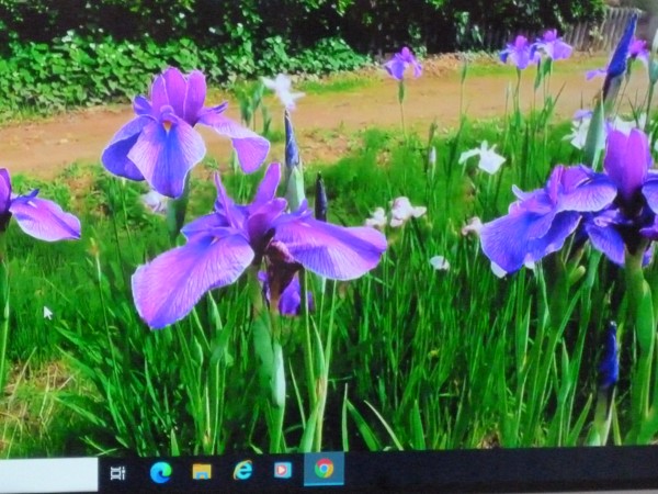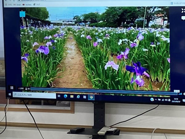 65インチの大型テレビに映し出される”色とりどり”の花菖蒲に