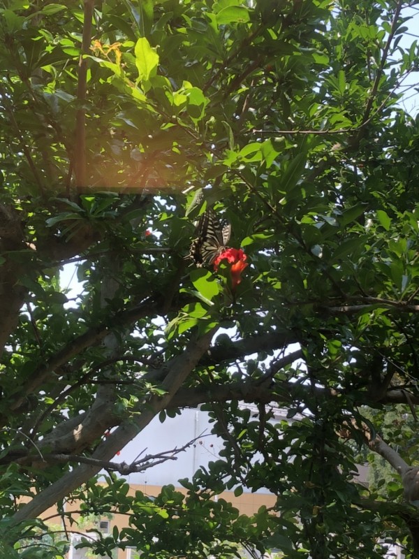 キアゲハがザクロの花の蜜を吸いにやってきました。
