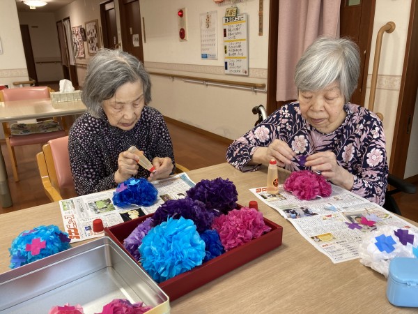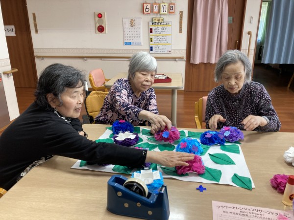 色合いを考えながらアジサイを貼り、余った十字の折り紙も「もったいないから」と空いている所に一人が貼りだすと皆も一緒に…