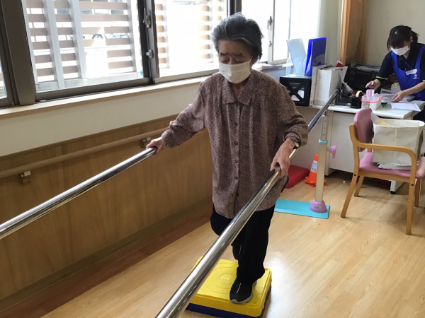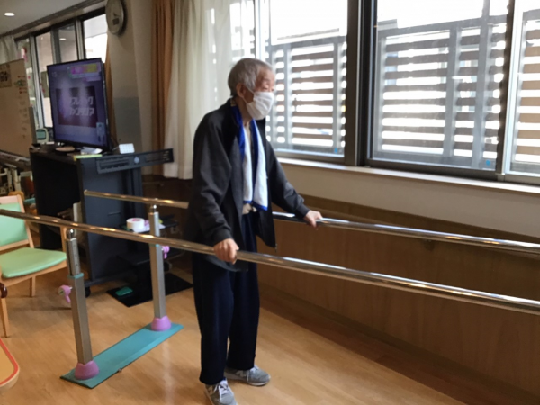 平行棒で歩行訓練をしたり、マシンを使ってトレーニングしたり、その日の体調やご希望によって、色々行っています。