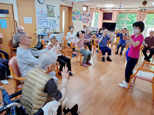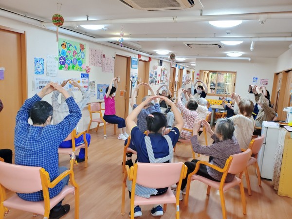「今日の体操で若くなった人は手で大きなまるを作ってくださ~い!」