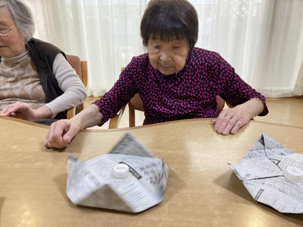 ペットボトルのキャップと新聞紙を使ってコマ作りを