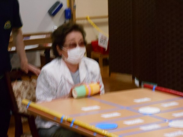 今日のレクリエーションは、ボールの入った紙コップを転がして点数を競うそーっとコロコロ!