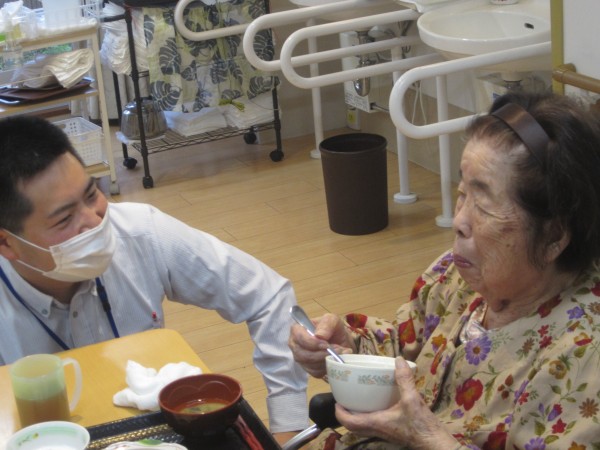 ご利用者様は昼食前の日課のラジオ体操・アルソック『ALSOK』体操・口腔体操後の昼食で、