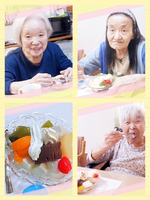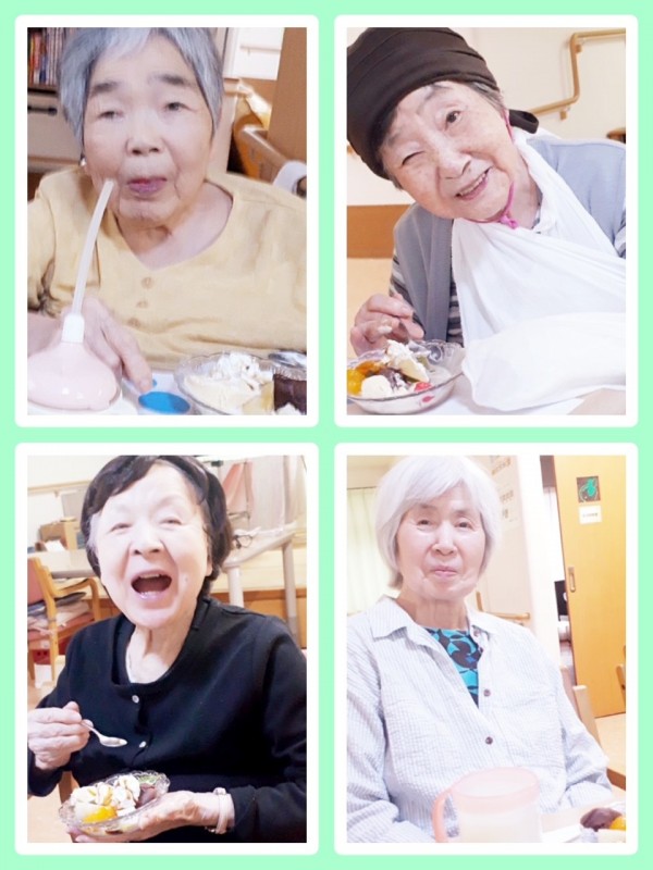 M様は食事のときは介助でやっと食べるのに、クリームあんみつは一人で上手に食べました。