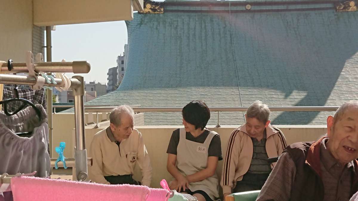 暖かい日などは、お昼ご飯のあとに食休めとして外の空気を吸いまったり過ごして頂いたり、3フロアー合同で集まれるときはウッドデッキに集まり童謡や昭和の有名曲(美空ひばりなど)を皆さんで大合唱し、日頃のストレス(笑)を発散して頂いております( ˙Ο˙ )ノ♪