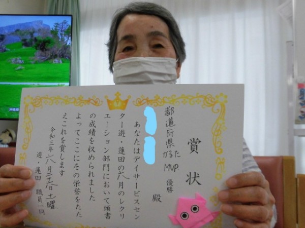 また、遊蓮田では現在レクリエーションで最も活躍された方にいつも賞状を渡しているのですが、それを10枚集めた方にはなんと豪華景品をお渡ししています!なので、捨てずにしっかりと管理して、10枚貯めた方は随時お知らせください♪