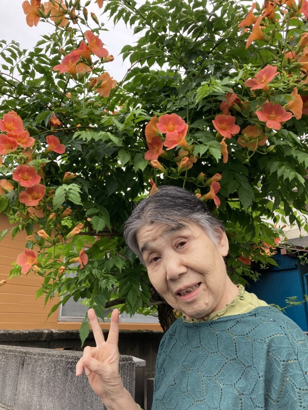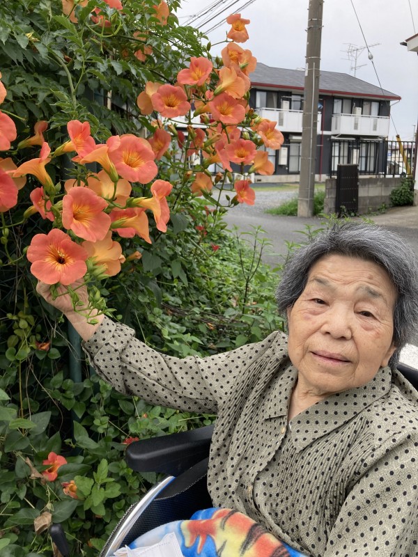 きれいなオレンジのお花の前で