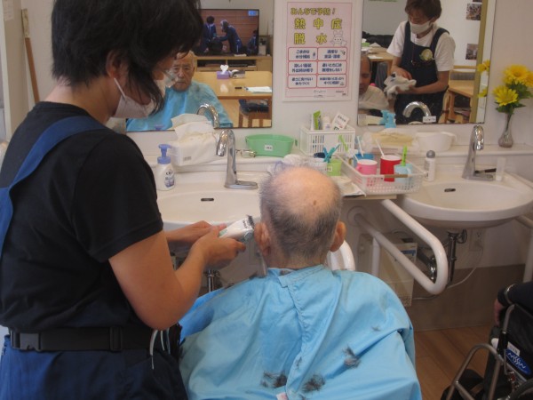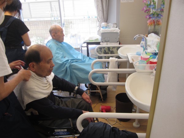 今月も多くのご利用者様が利用され、カットを終えると「どう?」「少し短かかったかしら」と話題は髪型に。
