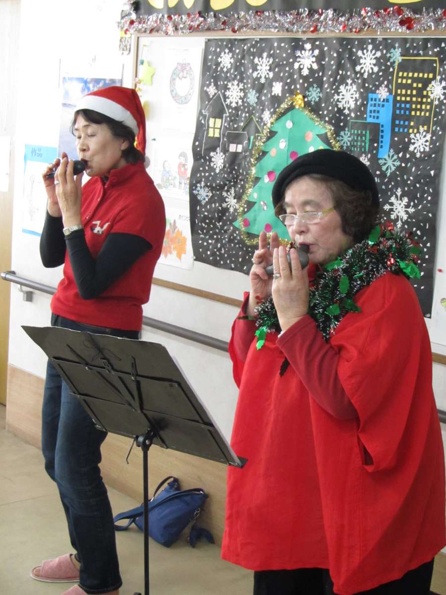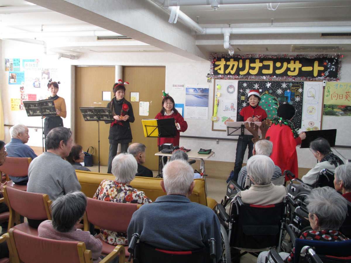 まず第一弾・・クリスマスとの事でボランティアさんにによるオカリナコンサートを演奏して頂き、なんとなんと!!職員の方が所属しているオカリナコンサートグループ(向日葵)でその職員も演奏してくれました。クリスマスソングから始まり、昔懐かしい曲などありご利用者様も手拍子や歌ったりと、とても盛り上がりました。