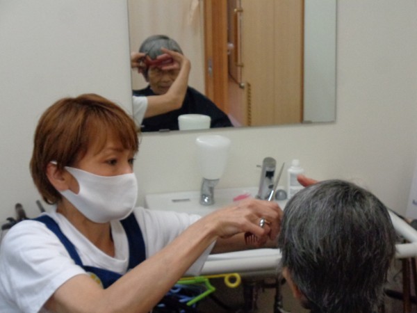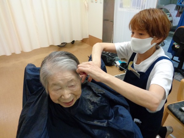今月は訪問理美容がございました。当ホームでは訪問理美容は隔月とのこと。ご入居者様は髪も首も長~くしてお待ちしていました。