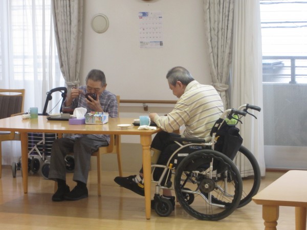 ご利用者様は昼食前の日課のラジオ体操・アルソック『ALSOK』体操・口腔体操後の昼食で、