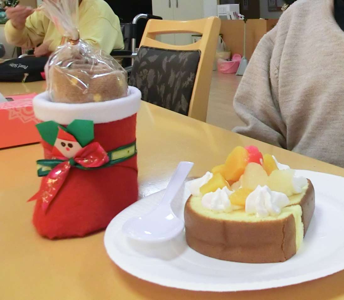 クリスマスケーキを食べて、職員手作りのサンタブーツの
