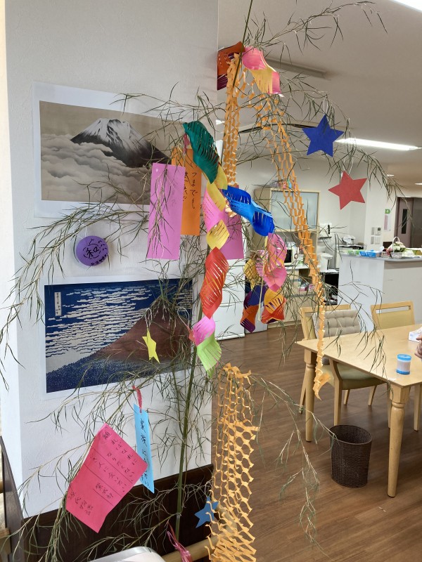 各階に笹の葉を設置し職員と入居者様で飾り付けを折り紙で作りました。
