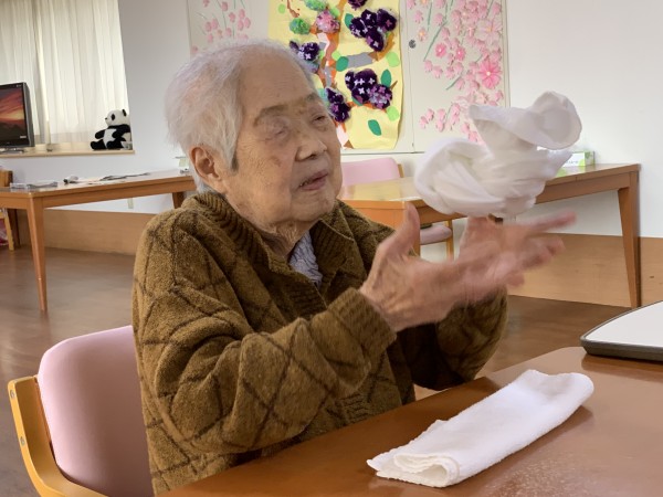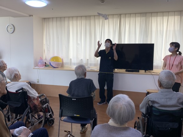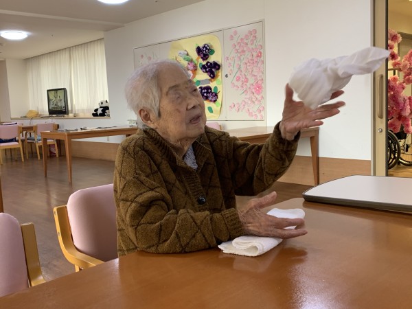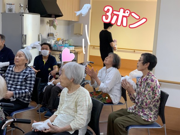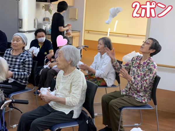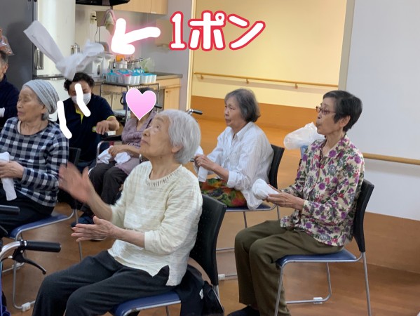 いつも、ご自分のテーブル席から参加される入居者様が投げています。