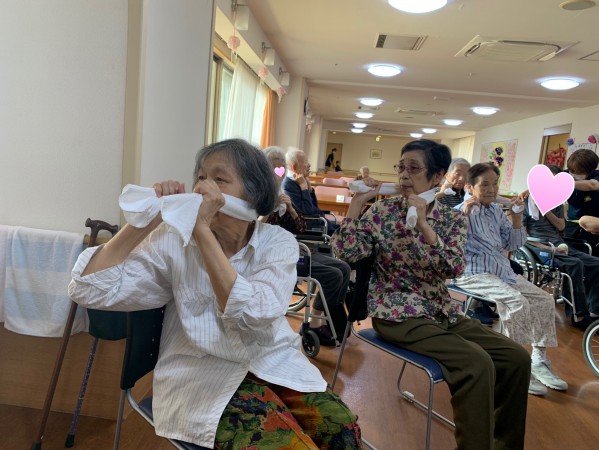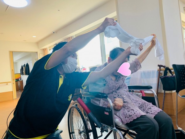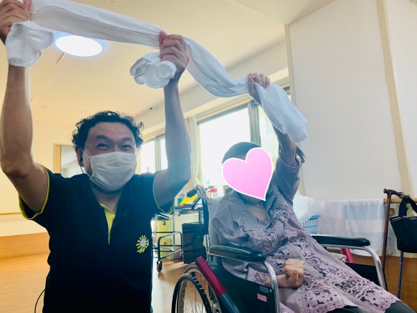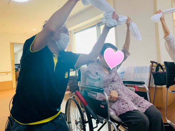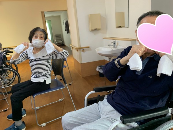 片側に麻痺がある方には、職員が一緒にタオルを持たせていただきました。